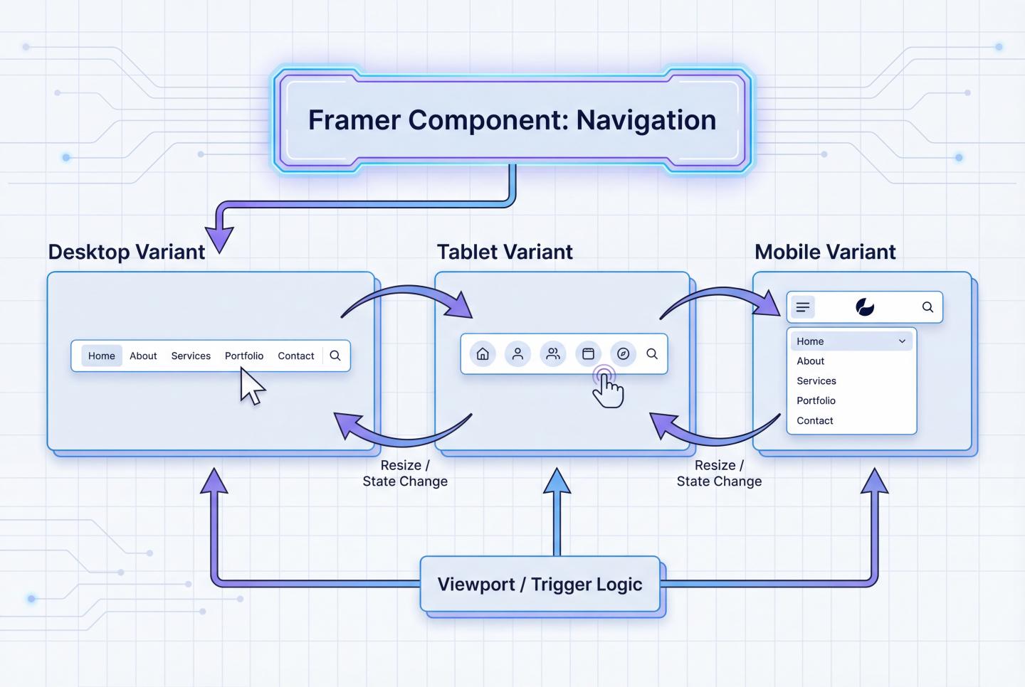 Component Variants: Use different component forms for different screens (e.g., navigation bar transforming into a hamburger menu).