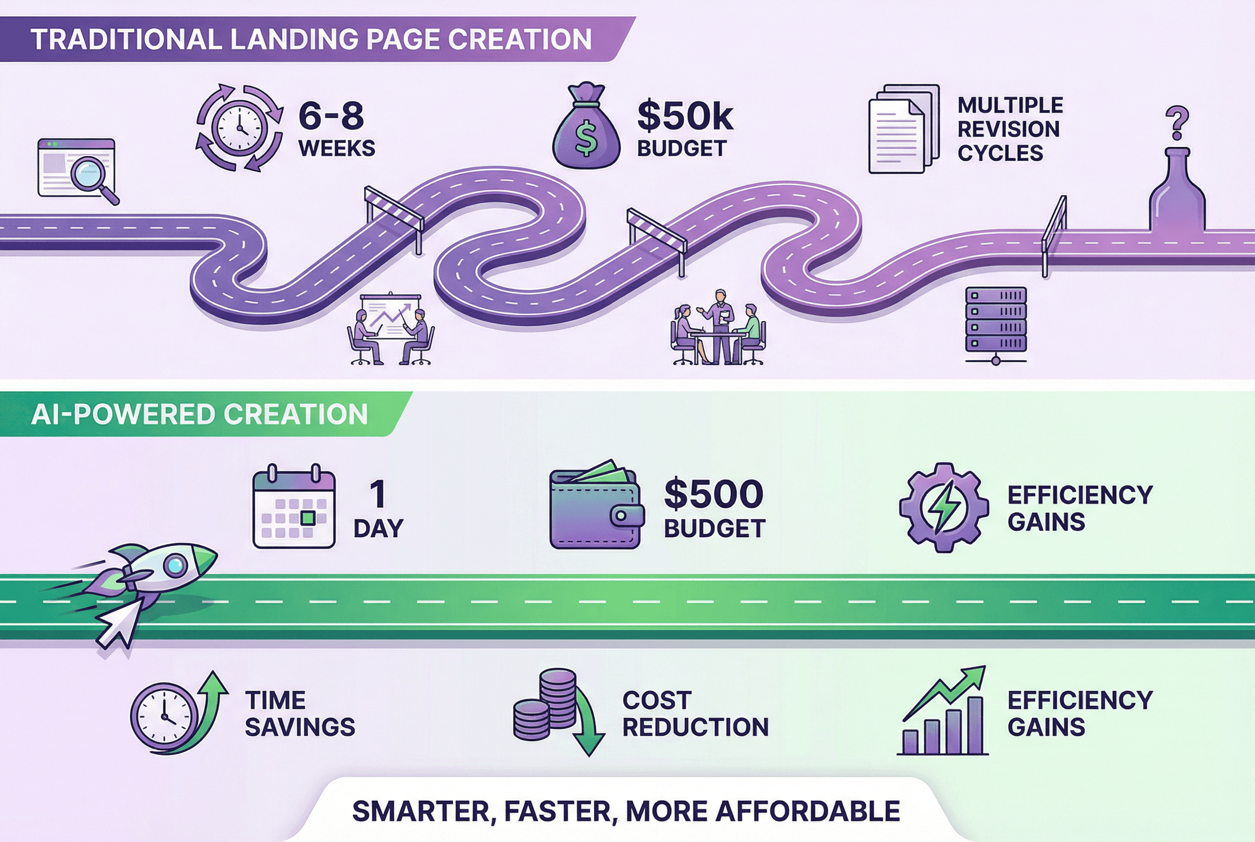 Traditional quote for 12 product line landing pages: $120,000, 4-month timeline.